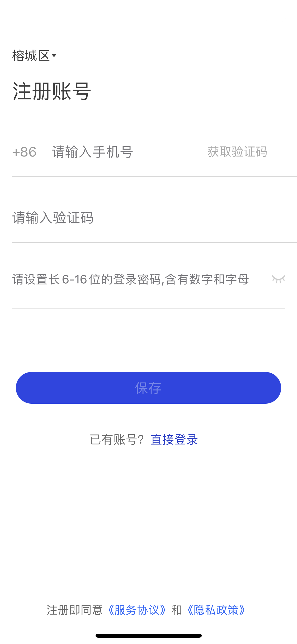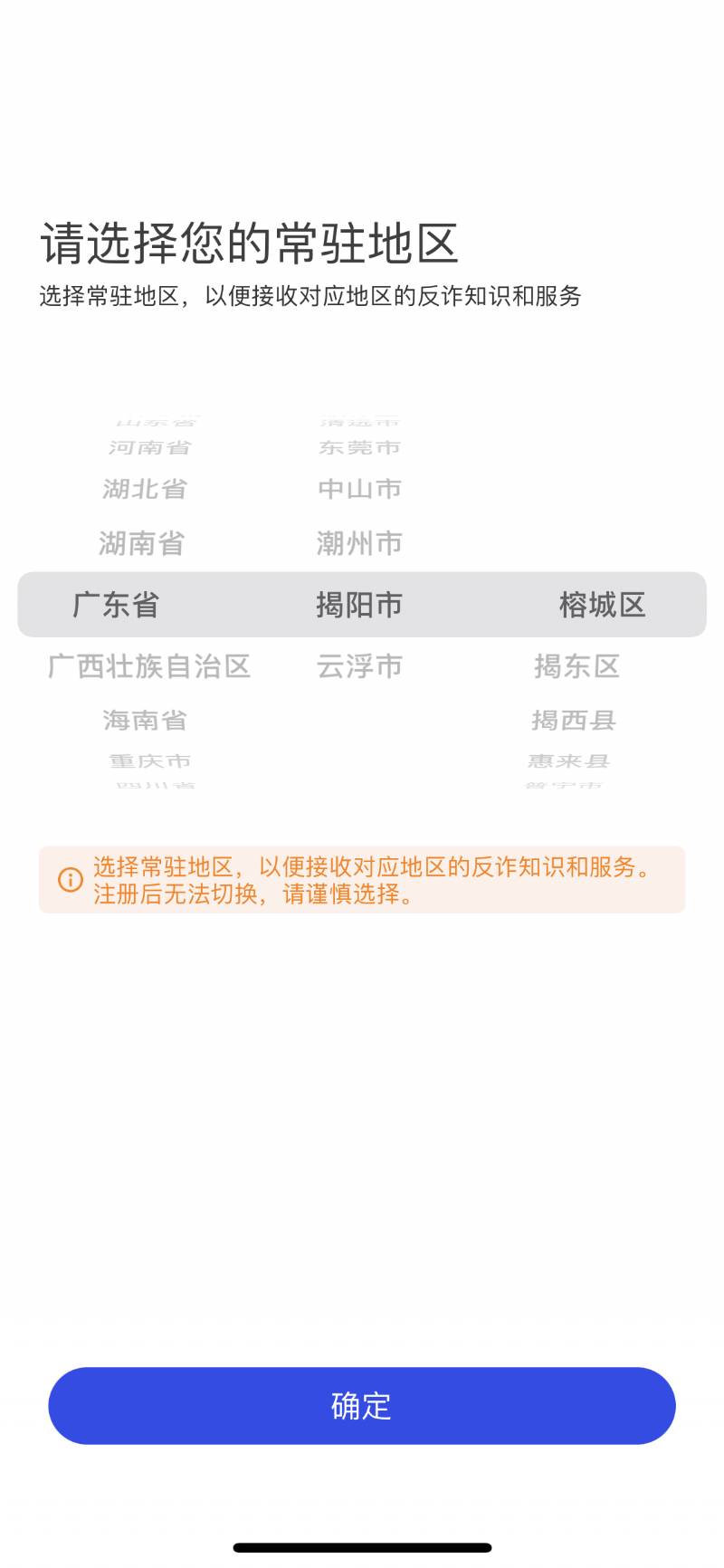 2、進(jìn)入APP后,首先選擇常駐地區(qū)完成注冊,然后進(jìn)入登錄頁面,點(diǎn)擊“快速注冊”。完善個人賬號信息后并保存。